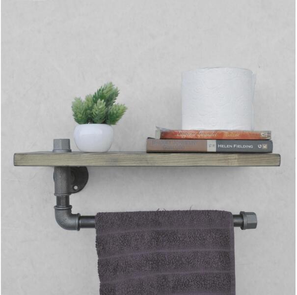 Fenyőfából készült falipolc törölközőtartóval. A modern stílusának köszönhetően bármely otthonba illik. A fa és a fekete fém kombinációja ipari stílusban. Maximális teherbírás: 3 kg.