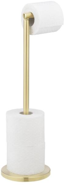 Praktikus 2 az 1-ben WC-papír tartó és póttekercs-tároló. Akár 5 tekercs befogadására alkalmas – 1 azonnali használatra és 4 tartalékként. Kompakt méretek, ideális kisebb fürdőszobákba és WC-kbe is. A stílusos matt arany kivitel elegáns megjelenést kölcsönöz a fürdőszobának. A masszív rozsdamentes acél tartósságot és hosszú élettartamot biztosít. A tekercsek egyszerű utántöltése és eltávolítása a praktikus lehajtható rendszernek köszönhetően. A stabil, kerek talp megakadályozza a felborulást. Méretek: 21 × 55 × 17 cm – helytakarékos, ugyanakkor elegendő tárolókapacitást biztosít. Könnyű konstrukció, csupán 679 g súly a könnyű kezelhetőség érdekében. Alkalmas visszafogott és funkcionális kiegészítőként modern és klasszikus fürdőszobákba egyaránt.