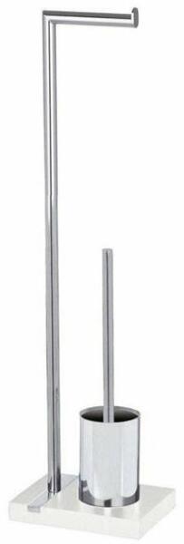 A Noble szabadon álló fürdőszobai állvány tartalmaz egy WC-papírtartót és egy WC-kefét tartállyal. - alapméretek: 15 x 20 cm- magasság: 74 cm- kefe cserélhető sörtékkel, 8 cm átmérővel- nyitott tetejű tartállyal- stabil talapzat fém ékezetekkel- anyag: krómozott acél- szín: ezüst