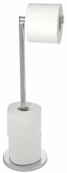 Szabadon álló fürdőszobai állvány (2 az 1-ben) WC-papír tartóval és tekercs tartóval (akár 4 tekercs). Kihajtható tartóval felszerelve a tekercs felakasztásához. A stabil kerek talp megakadályozza a felborulást. - magasság: 54 cm- hosszúság: 21 cm- szélesség: 17 cm- kihajtható fogantyú- anyag: rozsdamentes acél- szín: ezüst